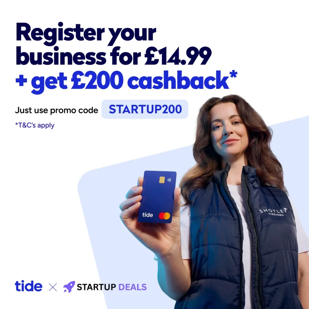 Get up to £200 cashback when you register your business with Tide – click here: https://companyformationdeals.co.uk/recommends/tide-company-formation/ (Just use the promo code: STARTUP200)